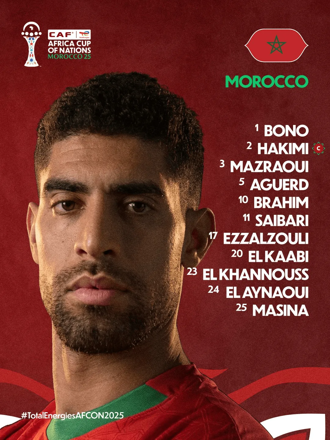 摩洛哥首发:1-布努、2-阿什拉夫(巴黎圣日耳曼)、5-阿格尔德(马赛)、25-马西纳(都灵)、3-马兹拉维(曼联)、23-哈努斯(斯图加特)、24-艾纳维(罗马)、11-萨伊瓦里、10-卜拉欣-迪亚斯(皇家马德里)、20-卡埃比、17-阿布德(皇家贝蒂斯)